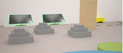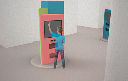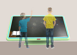 Children using digital glasses (obtained from glasses kiosk) to enable digital personal librarian, interacting with information systems in the library. The glasses also serve as a wayfinding tool as well as gps for parents.