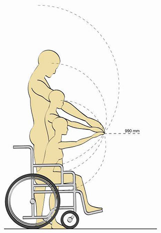 Human reachable range decreases with age. The normal intersect of reachable range for adults is 990 mm. As age goes, there is an average of 70 mm range of reaching difference between people aged 40 and 80.