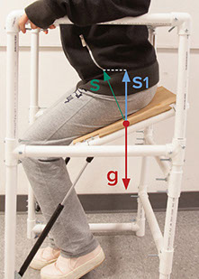 Has to reach chair arms before sit down.